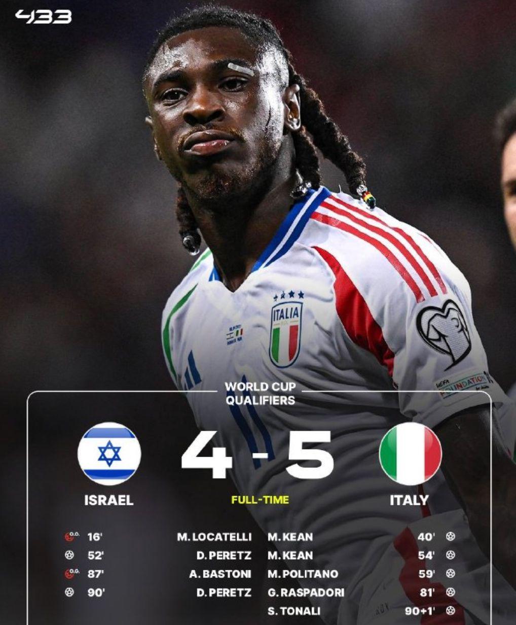 半场结束前,意大利队扳平了比分。下半场,以色列在第52分钟再次领先。但是,意大利队2分钟后马上扳平。第58分钟、第81分钟,意大利队连进2球。这个时候,意大利队并没有收缩防线,仍在高位逼抢。