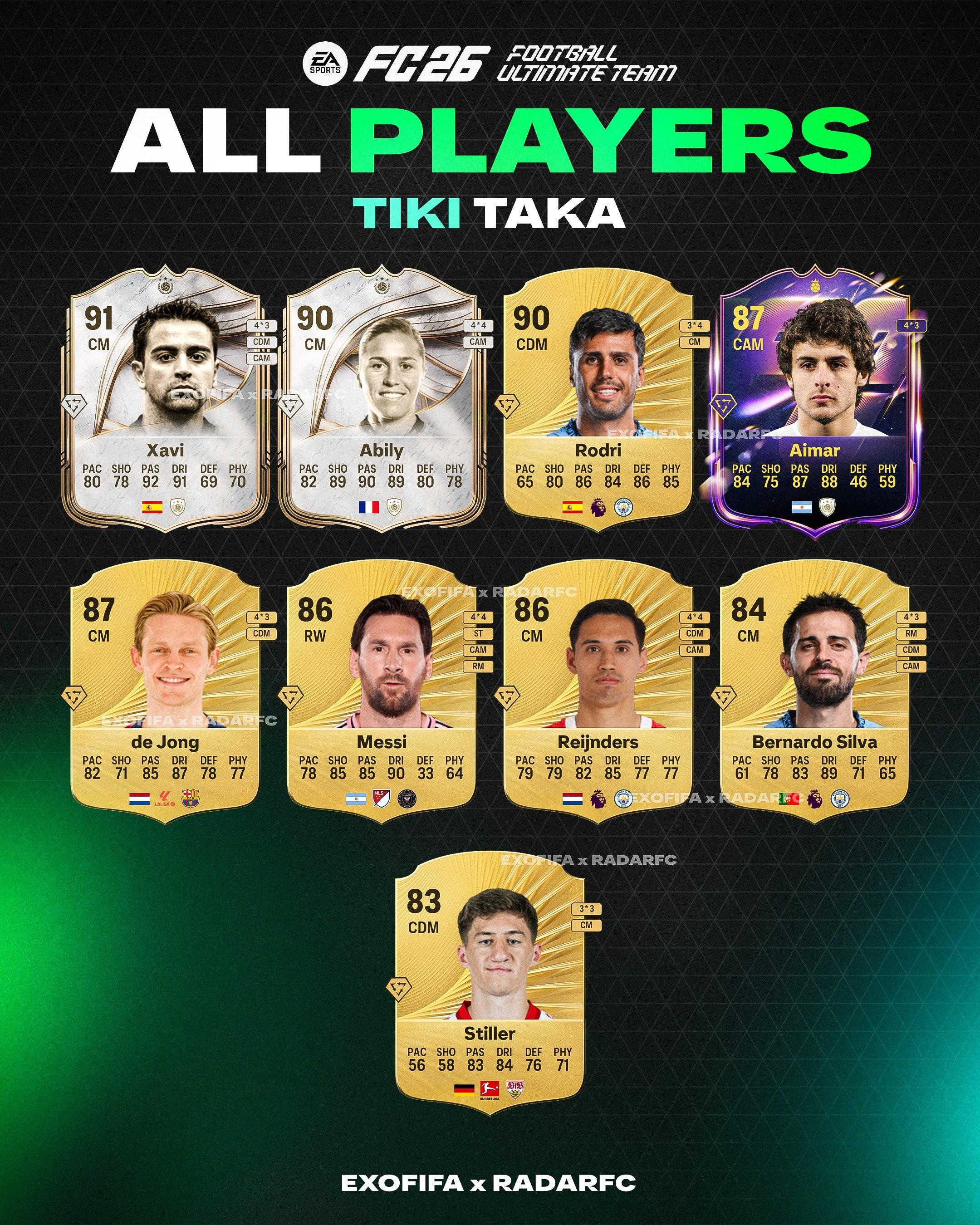 《FC26》金TikiTaka球员已经被曝光,其中,罗德里、德容、梅西、B席、赖因德斯在列。该特技作用:球员在接到球的第一时间,就能以极高的精准度完成地面传球。即使是在身体姿势不佳、难以正常传球的情况下,他们也能将球精确地传到队友脚下。在进行短距离的地面传球时,这个特技的效果尤为突出。传出的球速和线路都非常精准,就像是为队友量身定制的一样。完整球员:哈维、卡...