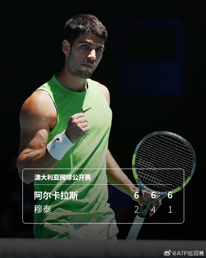 #阿尔卡拉斯晋级澳网男单16强# 澳网男单第三轮中,阿尔卡拉斯以6-2/6-4/6-1击败穆泰,他接下来将和19号种子保罗争夺一个八强席位。