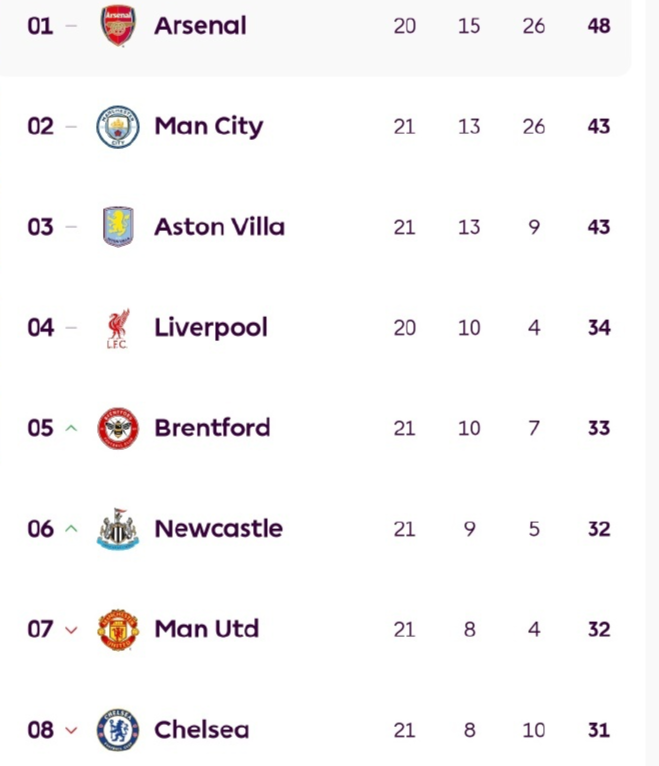 北京时间1月8日,英超第21轮再赛8场。4大传统豪门曼城、曼联、切尔西和热刺再次集体不胜。而本轮未赛的领头羊阿森纳,又一次成为大赢家。