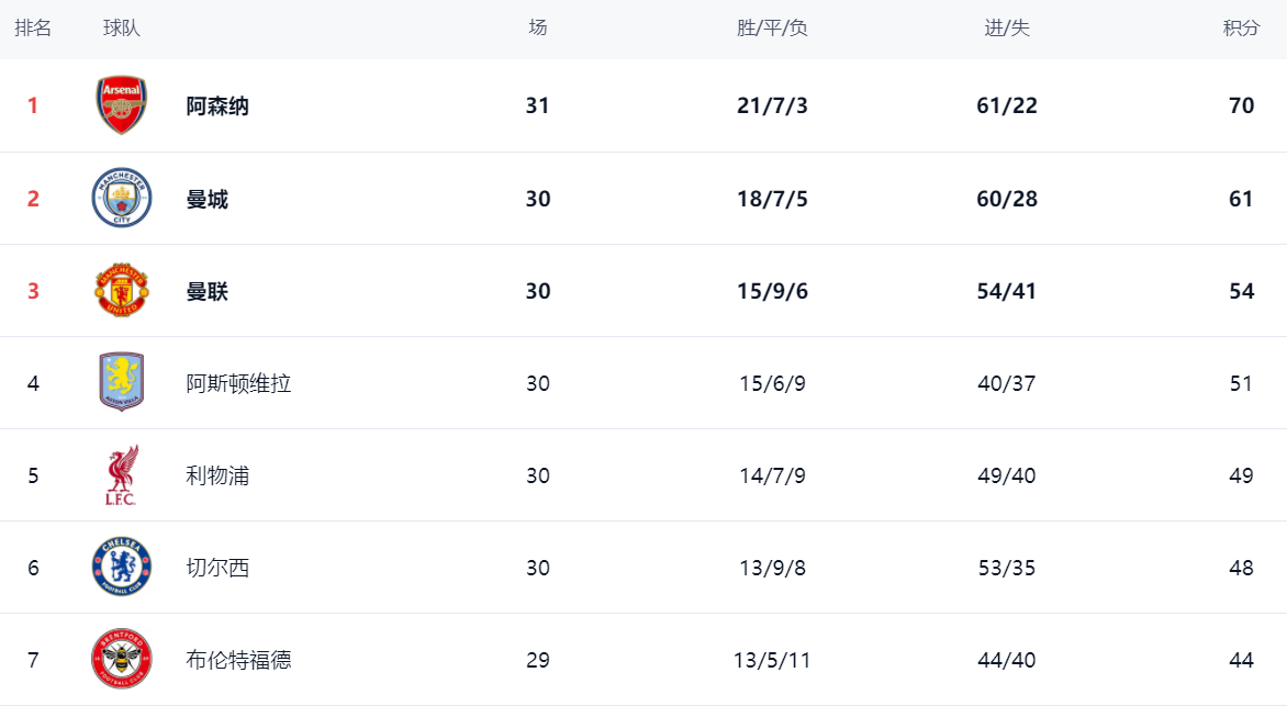 在积分榜上,阿森纳独领风骚,以70分排名榜首。曼城频频掉链子,与阿森纳的差距越来越大,落后了9分,排名第2,争冠基本无望了。曼联赢球之后,总积分达到54分,巩固了第3的位置。阿斯顿维拉51分,排名第4。这轮利物浦只拿到1分,总积分达到49分,排名第5,无缘杀入前4。切尔西48分,掉到第6名了。